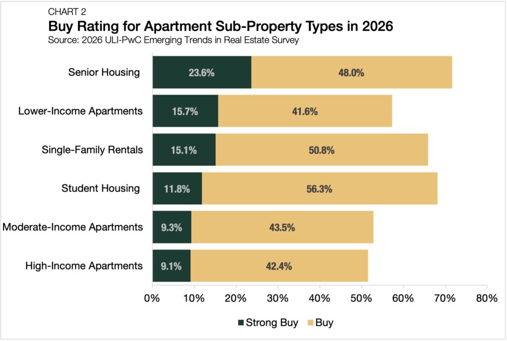 While traditional multifamily assets continue to anchor most institutional portfolios, the ULI-PwC report also highlights a growing shift among investors toward single-family rental, workforce, and senior housing as durable, long-term plays (Chart 2).