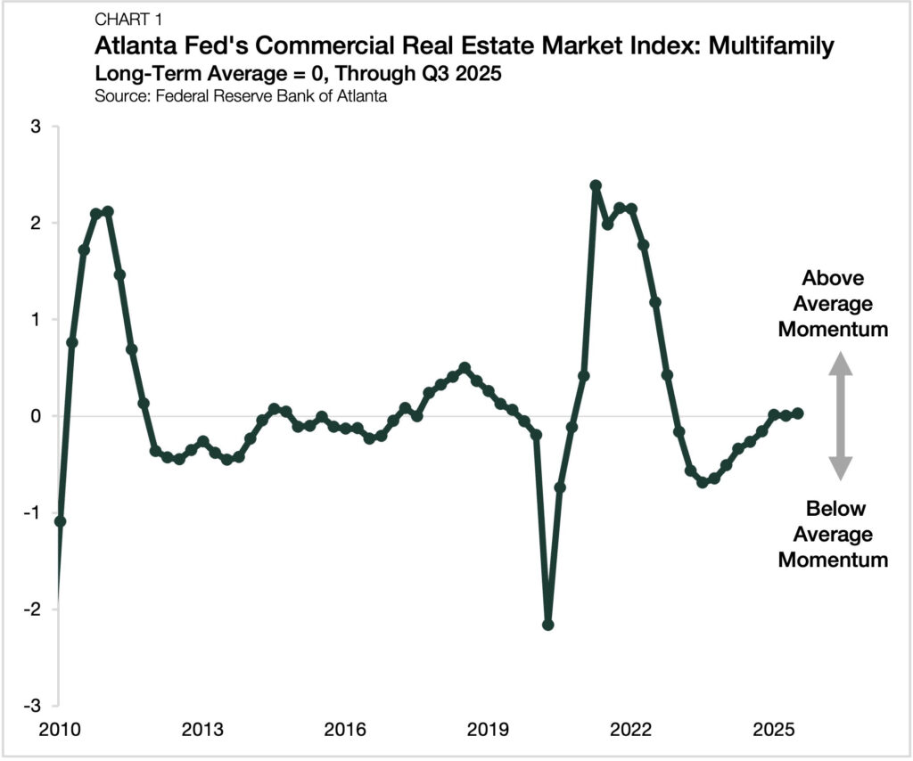 Through the third quarter of 2025, the median multifamily market in the U.S. registered roughly zero, indicating momentum broadly in line with long-run historical averages (Chart 1). The Atlanta Fed’s Commercial Real Estate Market Index (CREMI) reading, which measures how a market’s performance compares to its own historical average, showed a cross-market stabilization. Even after a pandemic-era surge and subsequent retreat, the median metro-level multifamily market has settled at or near its long-term average.