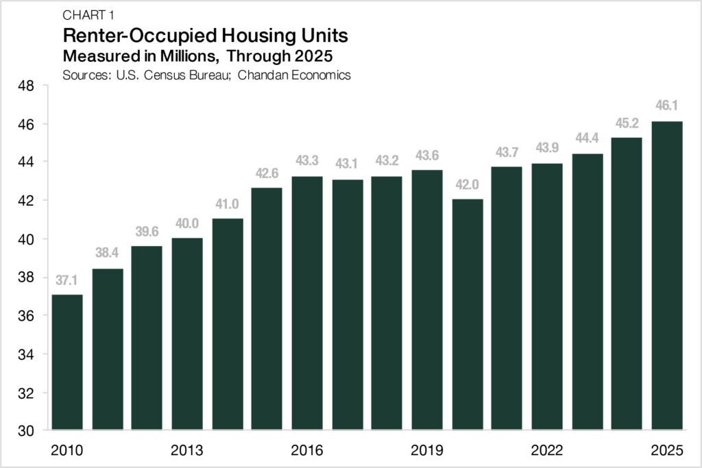 The number of rental households in the U.S., across all property types, increased by 898,000 in 2025, rising from 45.2 million to a new record high of 46.1 million (Chart 1). In contrast, the number of owner-occupied households rose by just 234,000 over the same period, reaching 86.6 million.