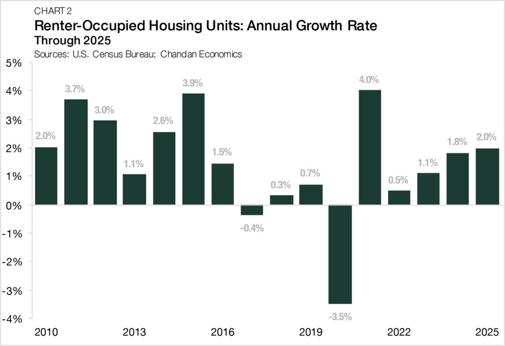 The relative annual increase for the rental housing sector was 2.0% last year — accelerating from 1.8% in 2024 and far outpacing the 0.3% growth rate of owner-occupied households (Chart 2).