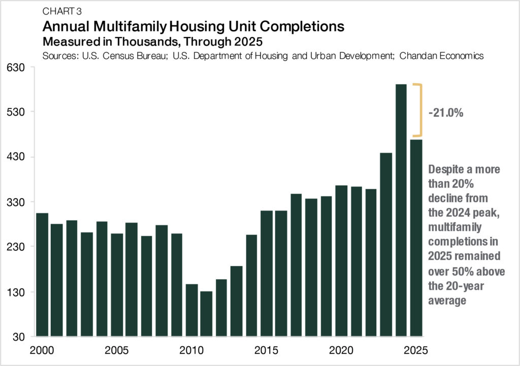 Builders completed roughly 467,000 multifamily units nationally last year (Chart 3). While it is a sizable decline, down 21% from its 2024 peak, completions remained more than 50% above the 20-year average, which indicates that the pace of new development continues to be historically elevated even as deliveries normalize.