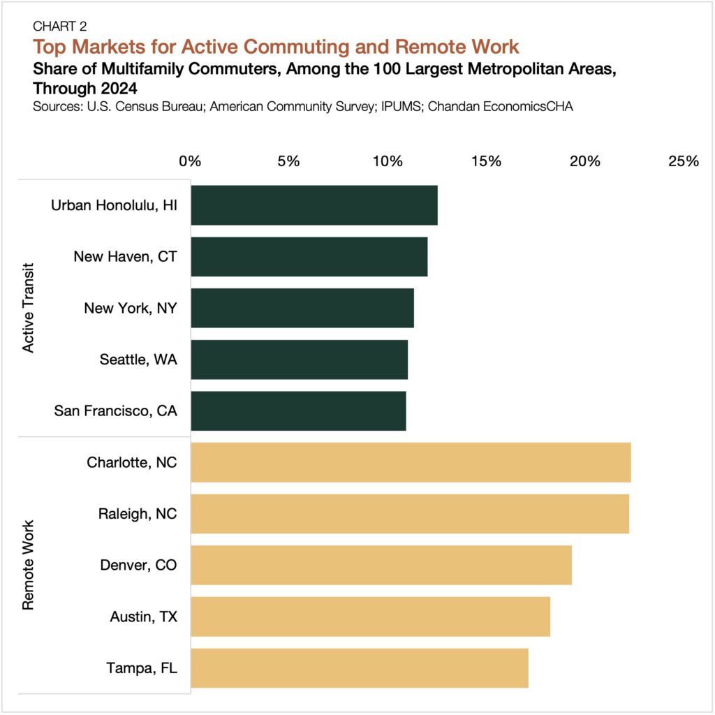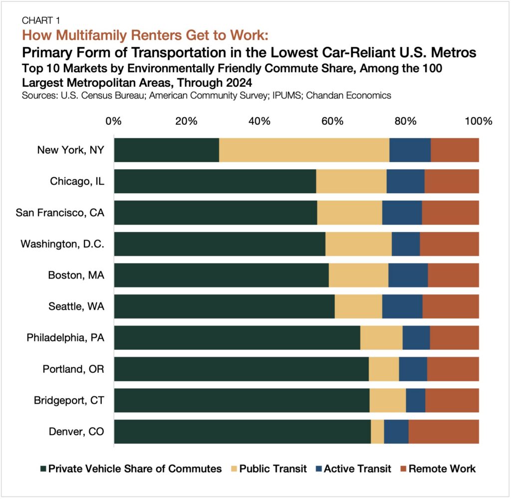 For multifamily investors, owners, and operators, commuting patterns provide a clear signal of how location and infrastructure shape renter demand. Markets with strong transit access, walkability, and proximity to employment centers tend to support more efficient, lower-emission travel. At the same time, active transportation and remote work are expanding renter flexibility. Together, these dynamics are strengthening demand fundamentals and giving major metros an edge.